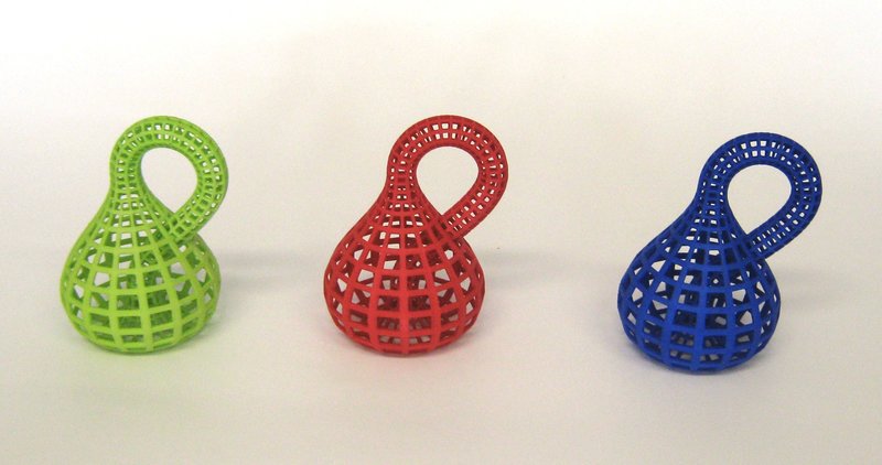 Dieses 8 cm große Modell der Klein'schen Flasche ist federleicht, stabil und zeigt die Besonderheiten dieser mathematischen Fläche. Die spezielle Gitterstruktur ermöglicht einzigartige Einblicke in diese außergewöhnliche Struktur.