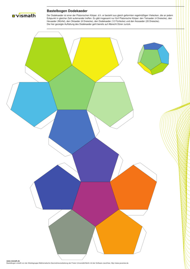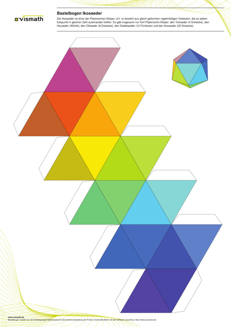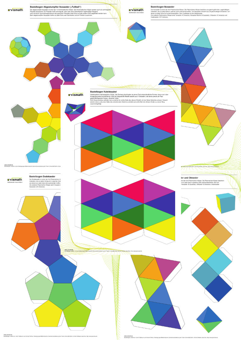 Dieses Set enthält fünf verschiedene Bastelbögen, mit denen man alle platonischen Körper, einen Fußball und das bewegliche Kaleidozykel basteln kann.