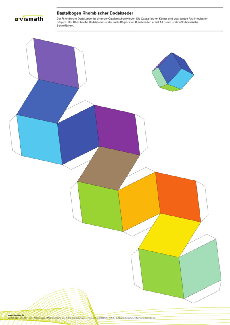Der rhombische Dodekaeder ist ein catalanischer Körper und dual zum Kuboktaeder. Dual bedeutet, dass man den einen Körper erzeugen kann, indem man die Mittelpunkte aller Seitenflächen des anderen Körpers miteinander verbindet.