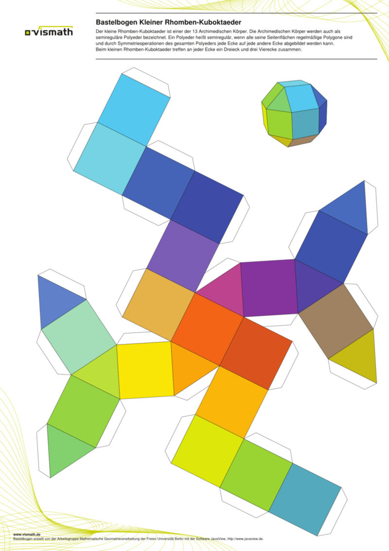Der kleine Rhomben-Kuboktaeder, der kleine Rhomben-Ikosidodekaeder und der Kuboktaeder sind drei archimedische Körper. An diesen Beispielen kann man alle Eigenschaften der archimedischen Körper entdecken. Mehr zu den archimedischen Körpern und ihren Eigenschaften am Ende dieses Beitrags.