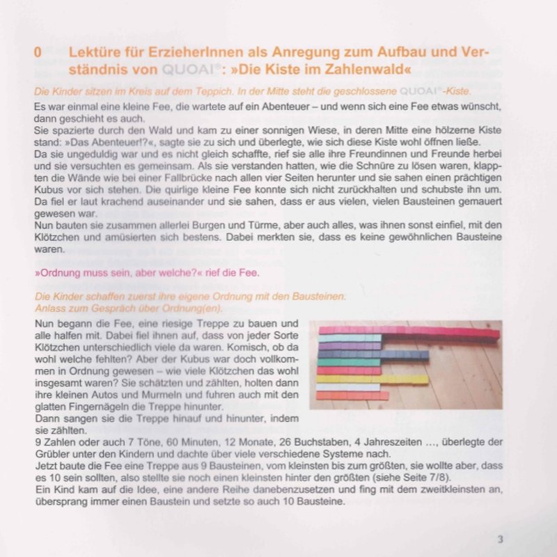 Dieses Handbuch ermöglicht es den Erziehern, Betreuern und Lehrern, die Kinder gezielt anzuleiten. Mit Quoai können Kinder sinnliche Erfahrungen machen, ausprobieren, unterschiedliche Lösungswege verfolgen und ihre Kreativität ausleben.