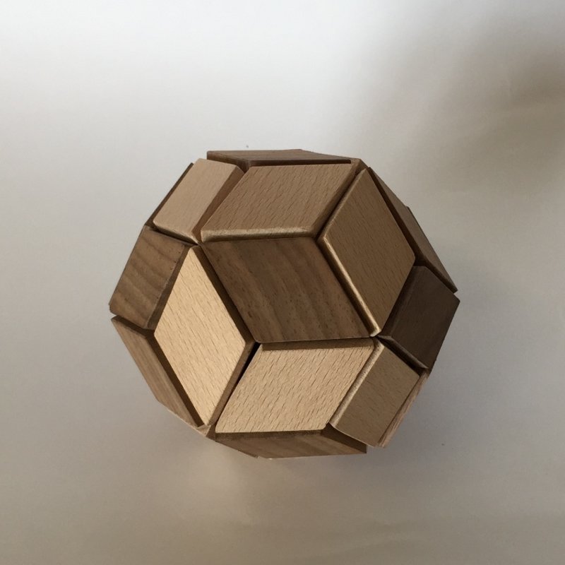 Dieses Modell des Rhombentriakontaeders ist wie alle Modelle ein echtes Unikat. Bei diesem Exemplar des Körpers wurden bestimmte Flächen mit Holz der Rotbuche gestaltet. Diese Flächen entsprechen genau den Seitenflächen eines Würfels. Dabei ist hier nur exemplarisch eines der fünf Paare von je sechs Flächen durch dunkleres Nussholz hervorgehoben.