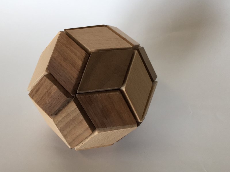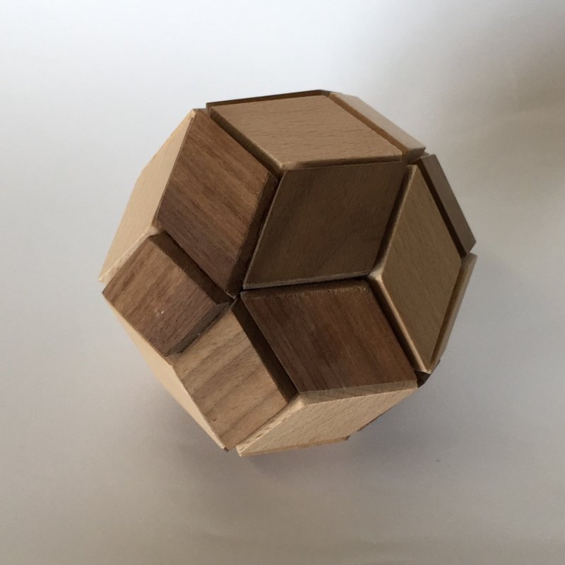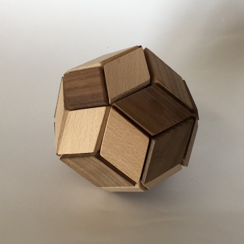 Diese einmaligen Holzpolyeder sind in beständiger Handarbeit vom Hobby-Bastler Stefan Schwarz geschaffen worden. Alle Modelle sind Einzelstücke. Dieses Exemplar besteht aus Nuss- und Buchenholz.