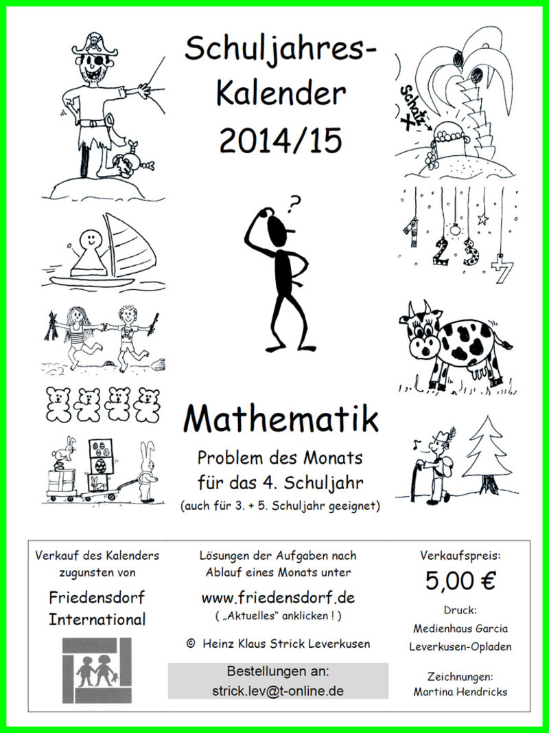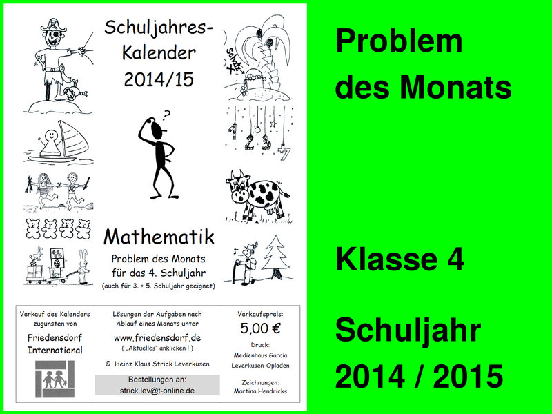 12 mathematische Knobelaufgaben in einem Kalender: Jeden Monat im Schuljahr 2014 / 2015 gibt es ein mathematisches oder kombinatorisches Rätsel. Im folgenden Monat kann man die Lösungen online nachsehen.