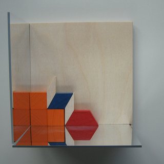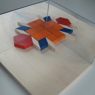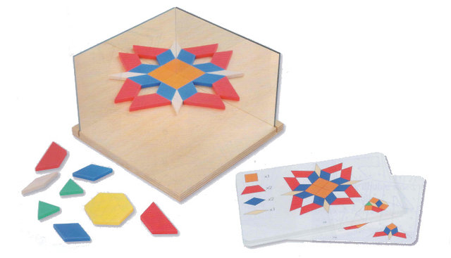 Die Pattern Blocks Holz im Multi-Eckspiegel: eine einfache Grundform aus sieben Steinen bildet im Spiegel ein symmetrisches Muster.