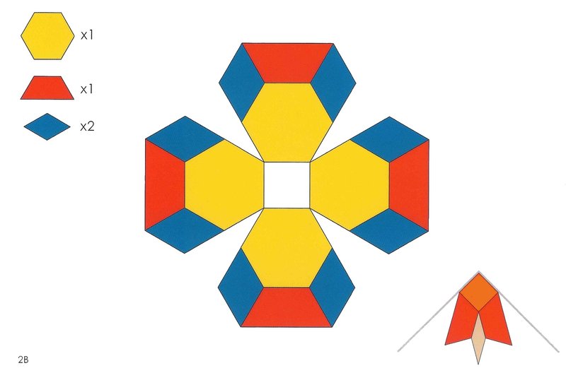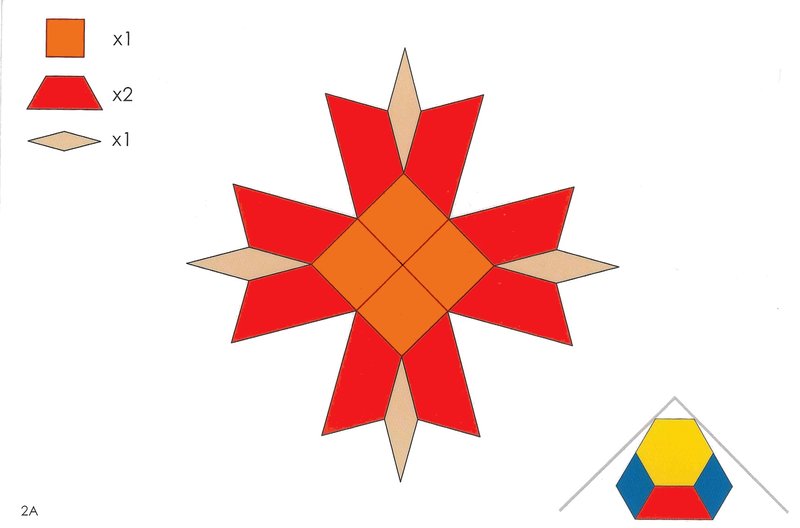Für Fortgeschrittene: Man kann später auch anfangen, die einzelnen Teile der Pattern Blocks durch andere zu ersetzen. Beispielsweise können statt eines gelben Sechsecks einfach zwei rote Trapeze oder drei blaue Rhomben gelegt werden.