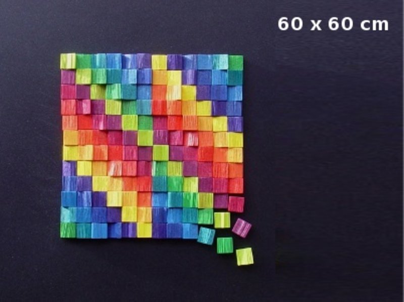 Das Magnetrelief besteht aus einer Metalltafel in schwarz (Maße: 60 x 60 cm) und 144 Spaltwürfeln in 12 Farben. Die Tafel kann mit einem Nagel an der Wand angebracht werden. Und die 144 Würfel kann man nach Belieben auf der Tafel anordnen. An der Unterseite der Holzwürfel ist ein kleiner Magnet angebracht, durch den die Würfel an der Tafel haften bleiben.