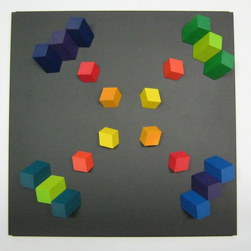 Wie bei allen Magnetreliefs haben die Holzrhomben an der Unterseite einen kleinen Magneten, mit der sie auf der Tafel haften. In dieser Variante erhalten Sie eine quadratische Magnetplatte (Maße 48 x 48 cm) mit insgesamt 36 Rhomben.