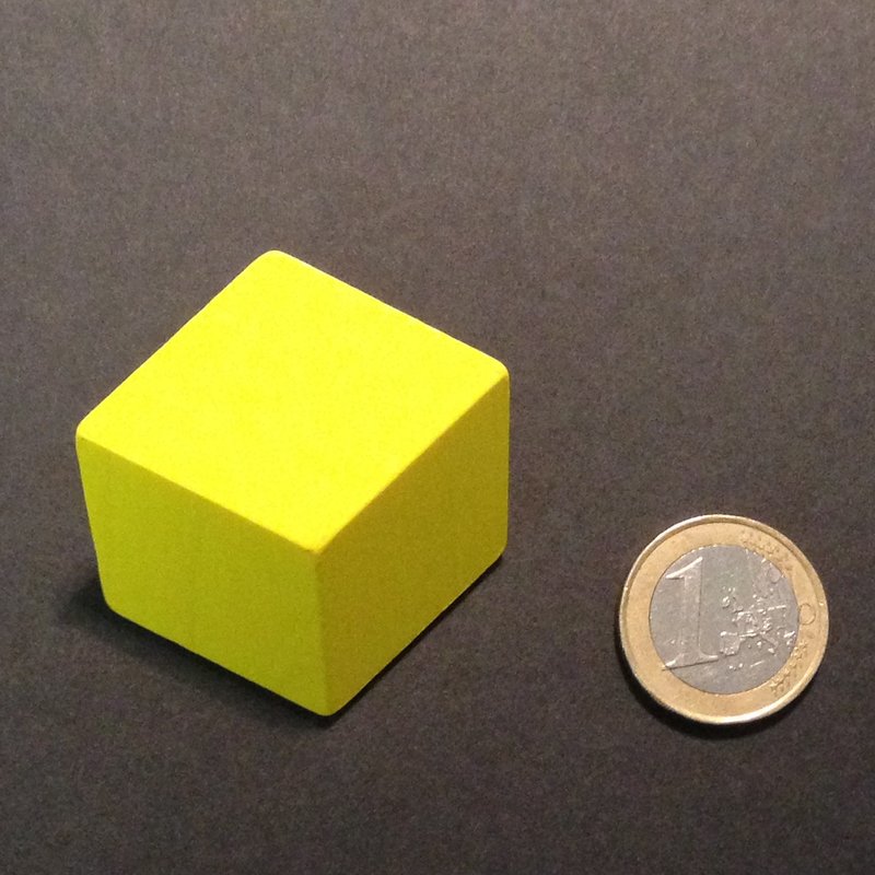 Die kleineren Steine haben eine Kantenlänge von 2,5 cm und eine Höhe von ca. 2 cm. Die großen Bausteine haben eine Grundfläche von 2,5 x 2,5 cm. Die längste Kante ist 5,5 cm lang. Insgesamt hat der große Baustein eine Höhe von 4,5 cm.