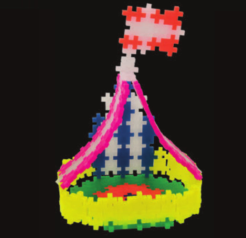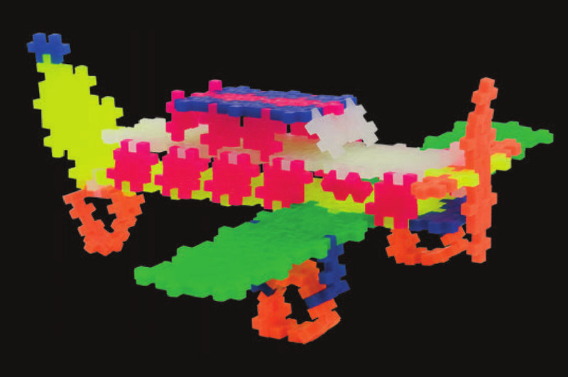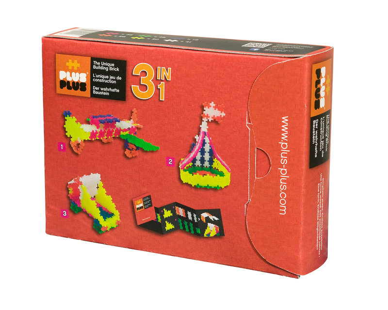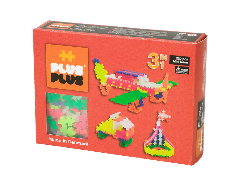 Das 3-in-1-Set mit 220 Neon-Teilen ermöglicht drei weitere Plus-Plus-Modelle. Mit diesen Teilen können Sie ein Propellerflugzeug, ein Zirkuszelt und einen kleinen Transporter bauen.