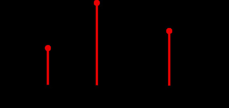 Verschiedene Wahrscheinlichkeitsverteilungen: eine diskrete Verteilung (links), bei der nur endlich viele Ereignisse eintreffen können (nämlich 1, 3 oder 7). Dann eine exponentielle Verteilung (mittig) und verschiedene Normalverteilungen (rechts)